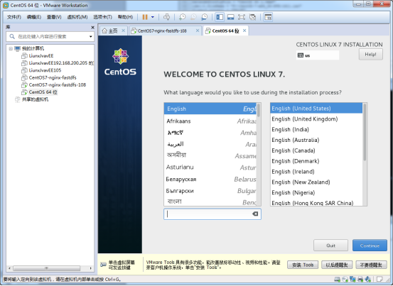 首先我們這里先選的是語言,如果是第一次安裝,建議先安裝中文版的熟悉一下centos7的配置,之后再選擇英文的進(jìn)行實踐。這里先介紹中文的吧。首次進(jìn)入界面看到?jīng)]有中文,我們需要鼠標(biāo)吧、點擊進(jìn)去,下拉手邊選擇中文。