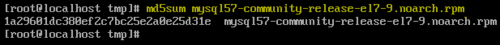 下載完畢后輸入“md5sum mysql57-community-release-el7-9.norach.rpm”生成MD5值并確保同官方網(wǎng)站上的MD5值(參考第3步)相同。 注意:建議運行此命令以確保文件無損壞。