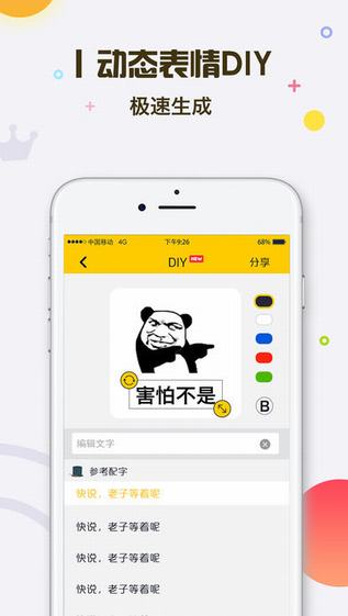 表情推薦不滿意?不要怕,我們還有全能的表情DIY圖文配功能,除了神級配字推薦外也可以根據(jù)自己的喜好挑選模板,發(fā)揮自己的想象創(chuàng)意,制作專屬你的表情包。