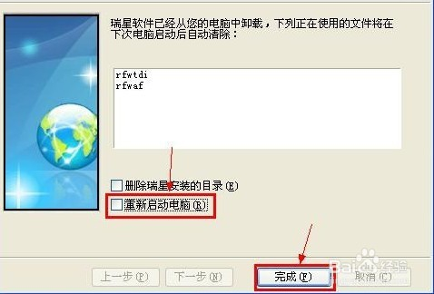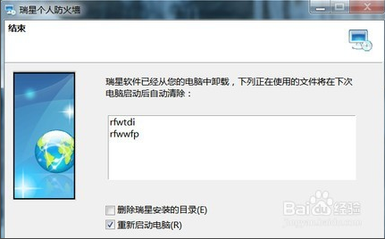 在“結(jié)束”窗口,建議不選中“重新啟動電腦(R)”,然后按“完成(F)”按鈕。這樣就完成了“瑞星個人防火墻”的卸載操作。