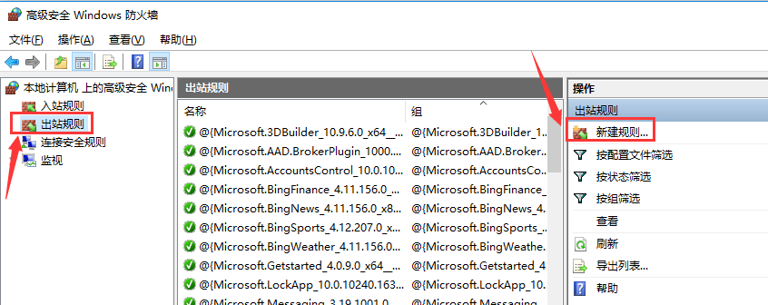 我們先點(diǎn)擊窗口左側(cè)的“出站規(guī)則”,然后點(diǎn)擊窗口右側(cè)的“新建規(guī)則”,