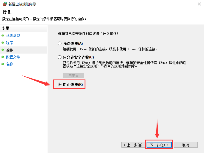這里我們選擇“阻止連接”,接著“下一步”,