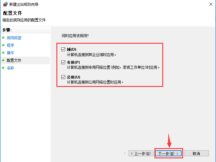 這一步我們將“域”、“專(zhuān)用”、“公用”全部勾選,然后“下一步”,
