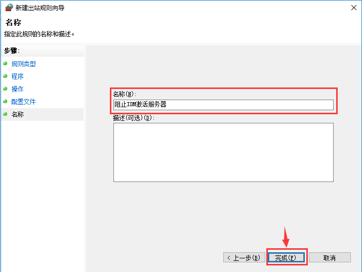 這一步我們給剛剛建立的防火墻規(guī)則起一個(gè)名字,比如“阻止IDM激活服務(wù)器”,描述里不用填寫(xiě),然后點(diǎn)擊完成。