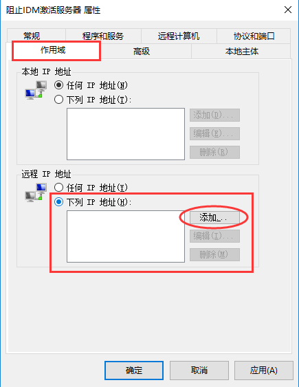 切換到“作用域”選項(xiàng)卡,然后在“遠(yuǎn)程IP地址”處勾選“下列IP地址”,接著點(diǎn)擊“添加”按鈕,