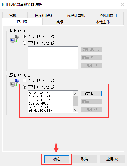 將以上IP全部添加完畢后,點(diǎn)擊“確定”按鈕,這樣阻止IDM與激活服務(wù)器的通信規(guī)則已經(jīng)完成。