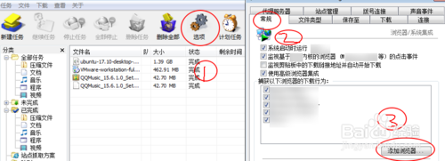 在一般情況下下載器會(huì)自動(dòng)關(guān)聯(lián)某些瀏覽器,那么點(diǎn)擊下載時(shí)候會(huì)自動(dòng)跳轉(zhuǎn)用它下載。但是有些有些瀏覽器則不會(huì)關(guān)聯(lián),那么如何添加關(guān)聯(lián)呢。在圖中點(diǎn)擊選項(xiàng),選著常規(guī),在數(shù)字3選添加瀏覽器。