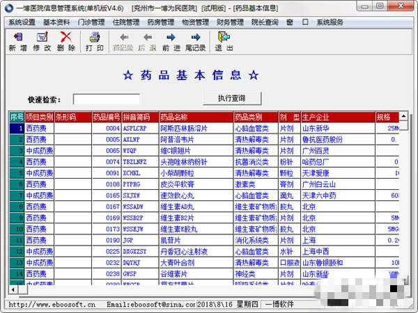 1、功能超強的獨創(chuàng)模糊查詢與字典功能。藥品可以按藥品編號、拼音碼、藥品名稱、藥品類別、藥品劑型、生產(chǎn)廠家等多種方式進行模糊查詢,開創(chuàng)國內(nèi)醫(yī)院信息管理軟件的先河,大大方便了您的操作,使您更容易的檢索到您需要查詢的內(nèi)容。2、界面采用電子表格風格,操作簡單、易上手,圖形化工具欄按鈕,讓您操作自如;所有單據(jù)完全按手工填單模式設計,立體顯示,空間感強;