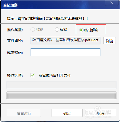 U盤超級加密3000的另外一種加密方法金鉆加密,打開是需要密碼,是需要臨時解密的狀態(tài)進行另存為的操作的。另存為的操作同閃電加密。