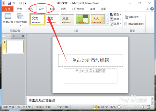 二、在PowerPoint2010程序窗口,打開“設(shè)計”菜單選項卡。如圖所示;