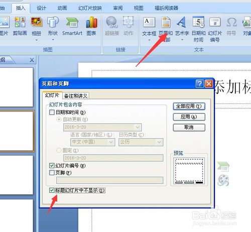 4、如果想首頁不進(jìn)行編碼,怎么辦呢?點擊工具欄上”頁眉和頁腳“按鈕,在彈出的界面中,點擊”標(biāo)題幻燈片中不顯示“,那么首頁P(yáng)PT就不會有頁碼了