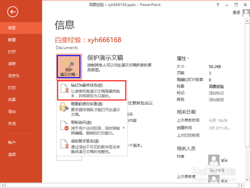3、點擊如下圖所示的“保護(hù)演示文稿”,之后在打開的子菜單中選擇“標(biāo)記為最終狀態(tài)”