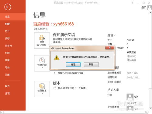 4、點擊“標(biāo)記為最終狀態(tài)”后,會彈出“該演示文稿將先被標(biāo)記為最終版本,然后保存”的提示框,直接點擊按鈕“確定”