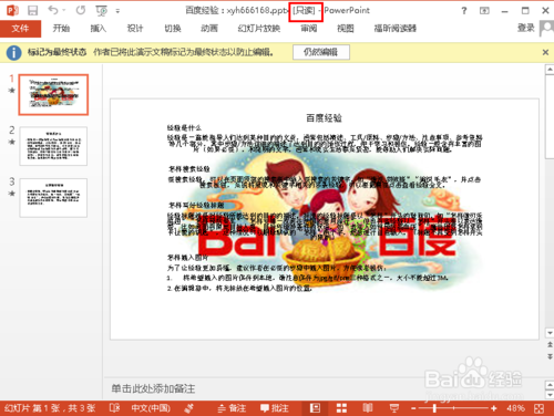 6、設(shè)置為只讀的幻燈片文檔后,標(biāo)題上面會顯示“只讀”,同時幻燈片文檔里面也會顯示相關(guān)提示信息,如下圖所示