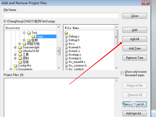 4.彈出下圖,點擊[Add All]添加當前文件,點擊[Add]添加自選需要的文件,點擊[Add Tree]添加該文件下的全部文件;然后彈出一個小框,點擊[OK]就可以,然后點擊[Close],這樣新建工程就大功告成,可以開啟Source Insight之旅。