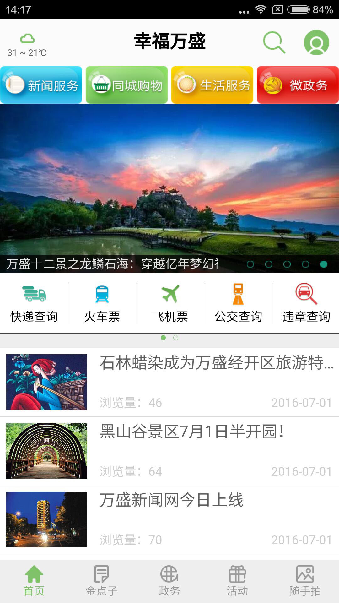 幸福萬盛app是萬盛經(jīng)開區(qū)黨工委、管委會主辦的黨政客戶端,同時也是推廣萬盛城市形象的綜合性移動應(yīng)用平臺。內(nèi)容主要以民生為導向,盡量把與老百姓密切相關(guān)的衣食住行、生老病死、吃喝玩樂以及各種政務(wù)服務(wù)“一網(wǎng)打盡”,并且突出展現(xiàn)萬盛旅游特色,同時提供最權(quán)威的區(qū)內(nèi)外、國內(nèi)外新聞資訊。主要功能突出查詢、咨詢、支付、互動活動等服務(wù),給老百姓工作、生活帶來方便、帶來實惠,成為老百姓離不開的“掌上秘書”。幸福萬盛app手機客戶端下載訪問不設(shè)置任何門坎,只要一鍵下載、輕松注冊,即可暢享最快捷、最方便、最周到的便民、政務(wù)、資訊等服務(wù)。親!無論你是萬盛老百姓,還是來萬盛旅游的游客、來萬盛經(jīng)商的客商,只要您輕輕一點,我將給您帶來驚喜!