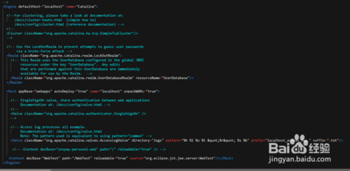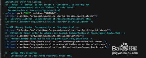 下面我們看一下server.xml。server.xml是tomcat的核心配置文件,里面配置容器的各種包含關(guān)系,以及路徑等。首先我們看到配置文件中配置了一系列的listner