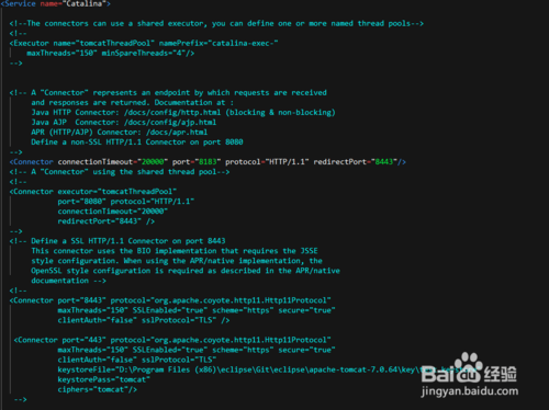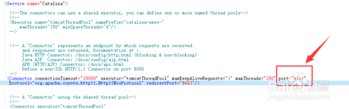 之后是配置訪問協(xié)議,<connector>可以配置http、https、ajp。里面配置了訪問的端口號,最大連接數(shù)、最大線程數(shù)、超時時間等