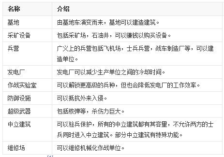 游戲中,根據建筑的不同,可分為以下幾個大類,游戲中沿用了原版所有的建筑,通過建設不同的建筑,玩家可以建造、生產不同的兵種。如下表: