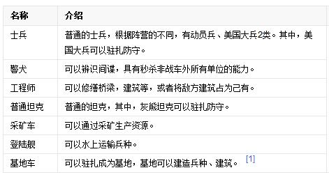 游戲中盟軍、蘇聯有自己的代表性兵種,全部沿用自原版的兵種。屬性無變化。分為步兵、戰(zhàn)車、戰(zhàn)艦、飛機四類。