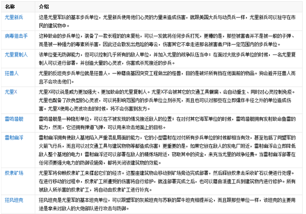 游戲與原版相比,增加了尤里陣營。如下表: