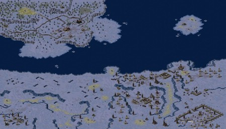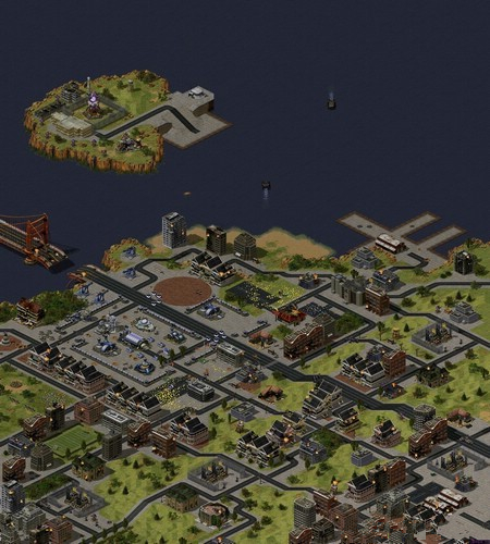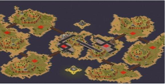 游戲內的場景地圖包括島嶼,山地,平原三種類型,玩家可以自行選擇地圖的條件以創(chuàng)建地圖。場景地圖全部沿用自原版。玩家在地圖中作戰(zhàn),地圖是該游戲的重要組成部分。地圖分為山地、平地、水域3種,在部分地區(qū)可能有采礦場,玩家可以指揮采礦車到采礦場。玩家可以戰(zhàn)斗開始前對兵種進行編隊、規(guī)劃路線。玩家一開始只有基地內的視野,并且沒有小地圖,必須要建造雷達或者空指部才能獲得包含迷霧的小地圖,單位探路和間諜衛(wèi)星、心靈感應器可以去除迷霧。除了裂縫產生器的效果外,迷霧一旦去除,永久可見。裂縫產生器所產生的迷霧只能通過單位探路去除,如果敵人來偵察,裂縫會在敵人視野中消失,在敵人離開后會重新制造裂縫。