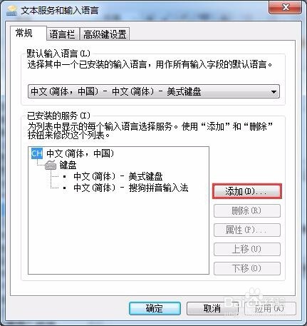在打開(kāi)的“文本服務(wù)和輸入語(yǔ)言”對(duì)話框中,選擇“常規(guī)”選項(xiàng)卡,單擊“添加”按鈕。