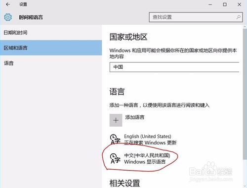 然后在左側(cè)菜單中點(diǎn)擊 區(qū)域和語(yǔ)言,此時(shí)會(huì)在右側(cè)出現(xiàn)已經(jīng)被安裝的語(yǔ)言。