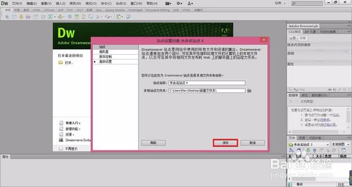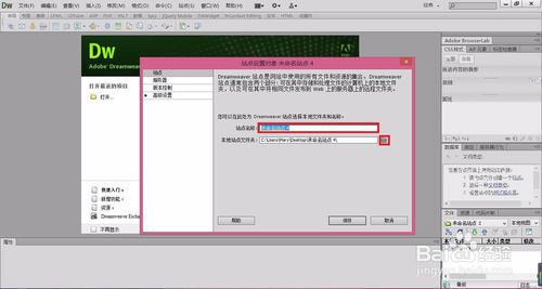 5、自動(dòng)彈出“站點(diǎn)設(shè)置對象窗口”。站點(diǎn)名稱可以自己設(shè)置命名,本地站點(diǎn)文件夾選擇你最開始新建的文件夾。