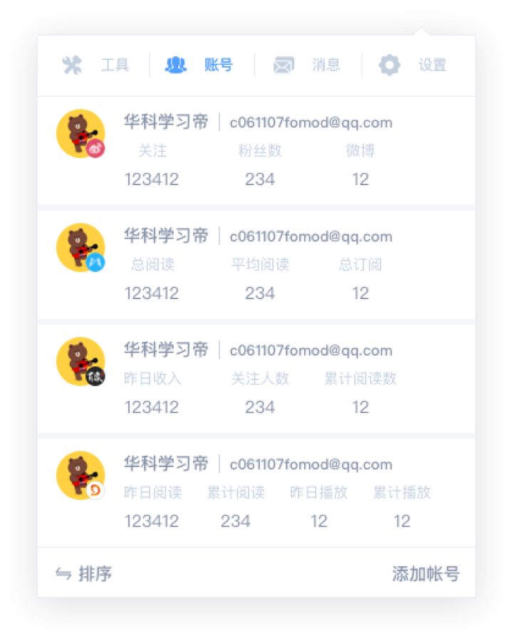 管理你所有的新媒體帳號(hào)一個(gè)工具管理你的所有新媒體帳號(hào)(支持包括微信公眾平臺(tái)、今日頭條、一點(diǎn)資訊、微博、知乎、網(wǎng)易媒體平臺(tái)、搜狐開放平臺(tái)、企鵝媒體平臺(tái)、UC大魚號(hào)、簡書、百度百家等11家新媒 體平臺(tái))。