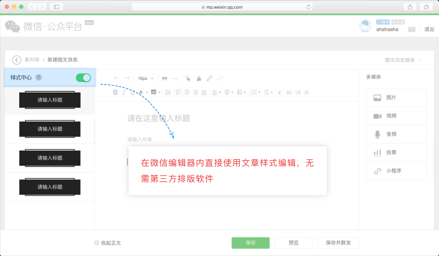 支持在微信公眾號(hào)后臺(tái)直接選擇并收藏經(jīng)常使用的一些文章樣式進(jìn)行排版