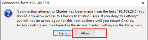 以上設(shè)置完成后,就可以捕捉到手機(jī)請求啦,連接成功后 打開你要測試的APP,進(jìn)行刷新動作,然后Charles會彈出確認(rèn)提示框,這時(shí)候選擇‘Allow’即可,如下圖所示: