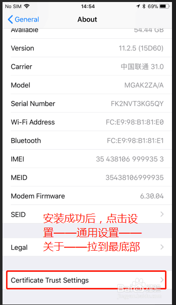 此時(shí)已經(jīng)安裝成功,還差最后一步,信任該證書,點(diǎn)擊設(shè)置——通用——關(guān)于——拉到底部——勾選信任該證書 ,如下圖所示: