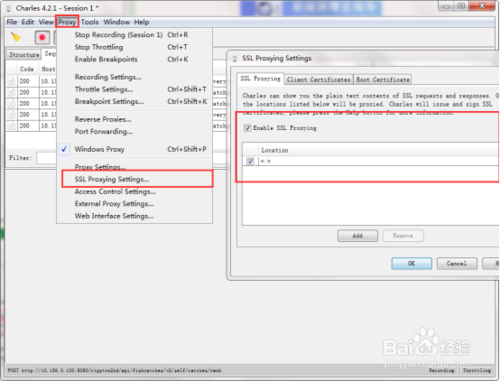 首先,charles是不支持抓去socket數(shù)據(jù)的。然后,如果抓不到https的數(shù)據(jù)的話,請查看你是不是沒有勾選ssl功能。Proxy-ProxySettings-SSL設(shè)置