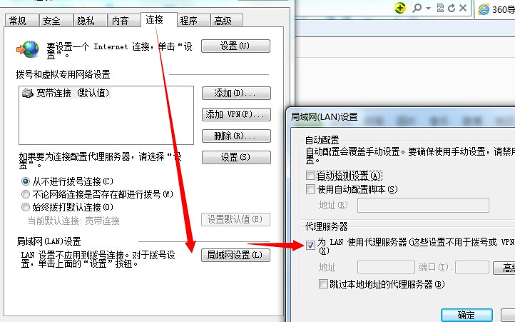 請確保360或者谷歌的代碼設(shè)置中是不是勾選設(shè)置的是使用IE代理。