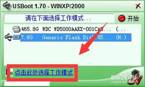1、首先打開usboot,插上你的U盤,然后會在磁盤的列表中顯示出你的電腦中的所有磁盤。如圖,我們點(diǎn)擊一下U盤。