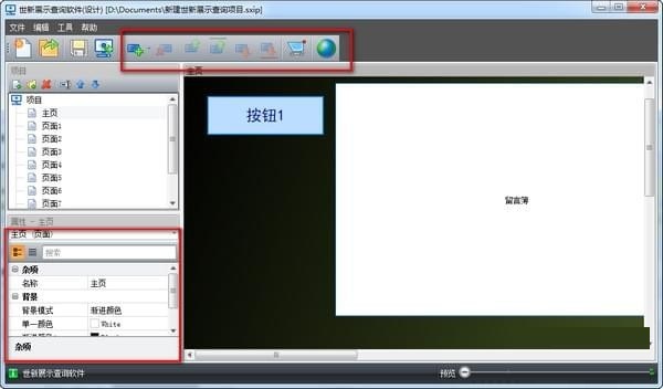 新建項(xiàng)目時(shí)軟件自動(dòng)在項(xiàng)目中添加11個(gè)頁(yè)面,如果展示項(xiàng)目需要更多的頁(yè)面,請(qǐng)點(diǎn)擊項(xiàng)目窗口工具條的“新建頁(yè)面”按鈕,如下圖所示: