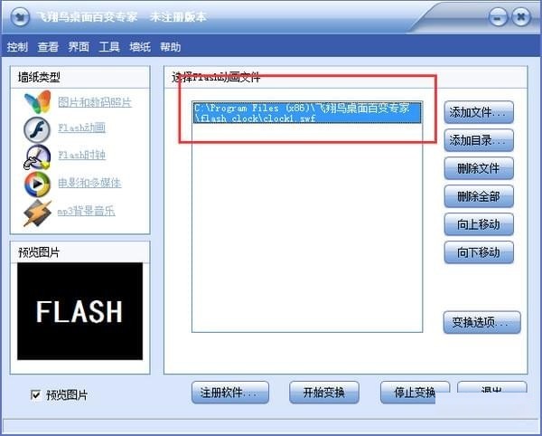 1.進(jìn)入程序后,在“墻紙類型”框中點(diǎn)擊“加入Flash動(dòng)畫”按鈕,右邊的列表框中出現(xiàn)選擇Flash文件列表框。