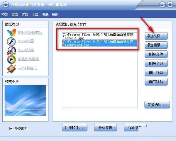 1.進(jìn)入程序后,在“墻紙類型”框中點(diǎn)擊“加入墻紙圖片”按鈕,右邊的列表框中出現(xiàn)"選擇墻紙圖片"文件列表框。