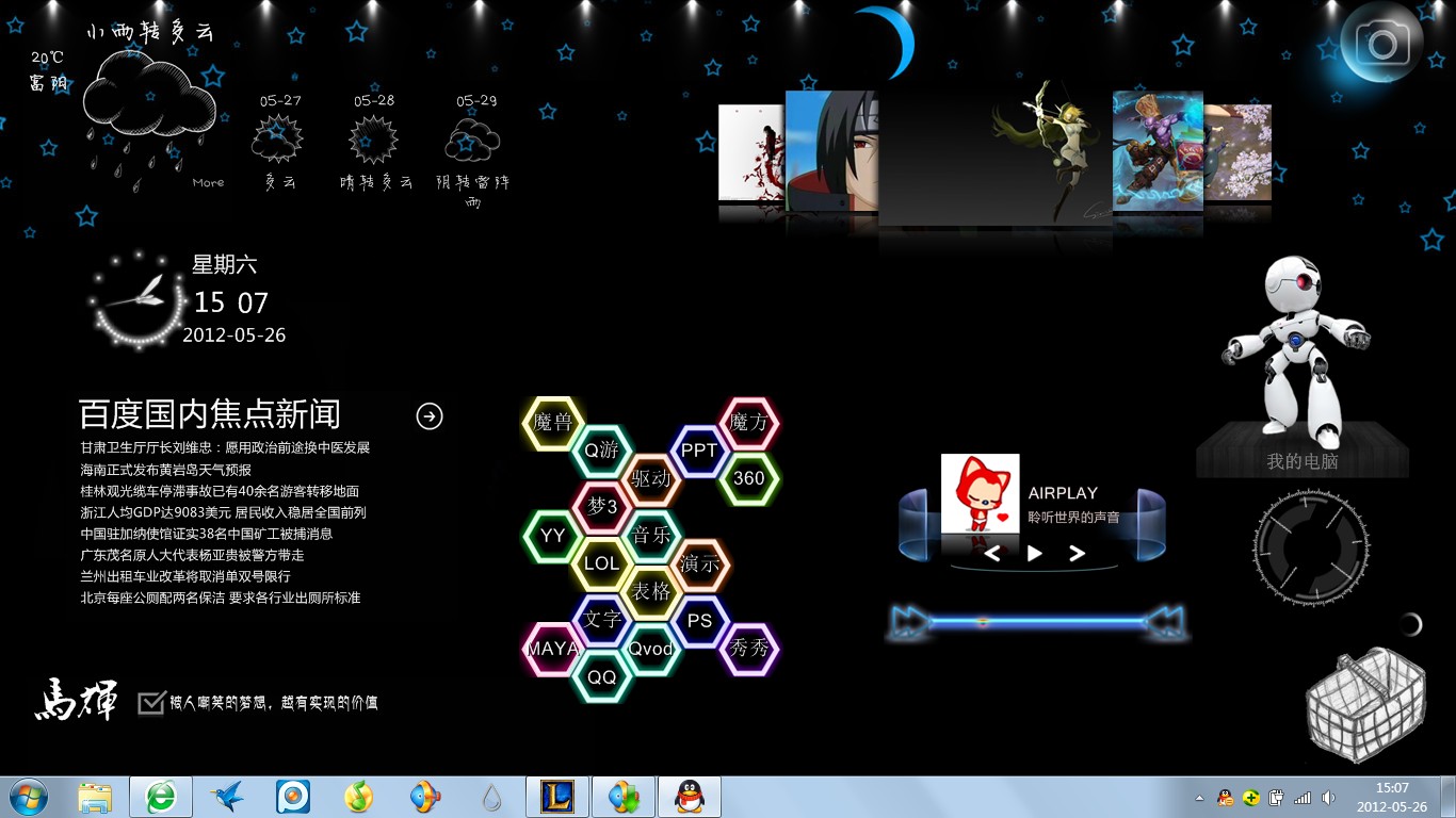 這邊的就是天氣預(yù)報(bào)始終以及萬(wàn)年歷的小工具了~~~這些東西就比較簡(jiǎn)單,大家在酷魚桌面的資源庫(kù)里下載好這樣的小工具然后設(shè)置一下時(shí)間地點(diǎn)啊什么的就可以了。。。