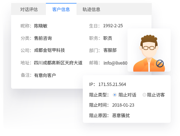 遇到騷擾訪客,可加入訪客黑名單進行管控,靈活設置管控有效期,期間訪客不能對話,客服可以看見訪客進入網(wǎng)站、瀏覽軌跡、訪客信息。讓客服避免無關(guān)訪客,工作變得更加專注。
