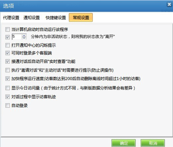 您可以設置“計算機啟動時是否自動運行Live800”;以及“計算機空閑時是否自動將客服的狀態(tài)改為離開”,“可同時登錄多個Live800系統(tǒng)”,“接通后自動開啟實時查看”,