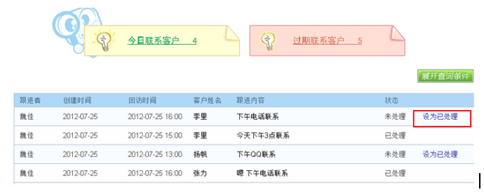查看已經(jīng)過期的聯(lián)系任務。點擊即進入任務列表,您可以更改該任務的狀態(tài),當把該任務設為“已處理”,則該任務會從過期聯(lián)系任務里清除。