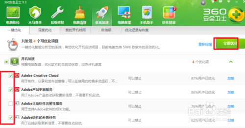 將涉及到Adobe的程序全部選中,然后點(diǎn)擊 立即優(yōu)化