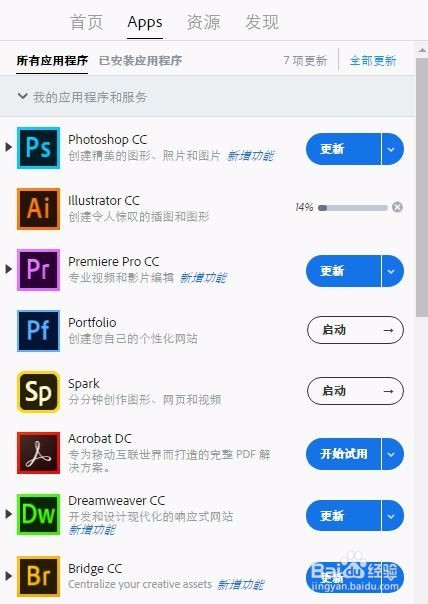 頂部菜單APPS就是程序列表,可以在這里安裝或刪除設(shè)計(jì)軟件。Adobe公司有很多設(shè)計(jì)軟件,例如PS、AI、PR、AE都是常用的軟件。