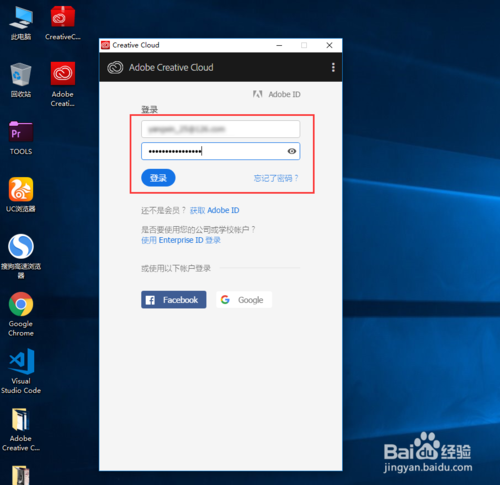 安裝完成會(huì),Adobe Creative Cloud會(huì)自動(dòng)打開(kāi)主界面,會(huì)提示我們要登錄Adobe賬戶。輸入賬戶和密碼后,點(diǎn)擊登錄。