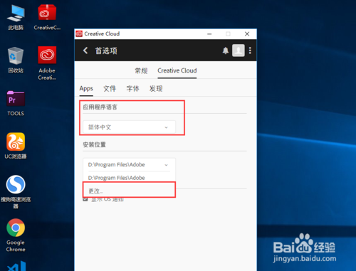 然后點(diǎn)擊Creative Cloud,可以設(shè)置安裝的設(shè)計(jì)軟件的語(yǔ)言以及位置,就設(shè)置好了。