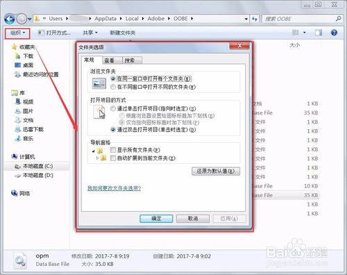 顯示隱藏的文件:在繼續(xù)下面的操作前,預(yù)防找不到opm.db 文件(因?yàn)橛行┤说碾娔X可能被隱藏了),所以先把隱藏的文件顯示出來(lái)(由于電腦版本不同,操作會(huì)稍有不同,但都是大同小異):點(diǎn)擊“組織”——“文件與搜索選項(xiàng)”,會(huì)彈出對(duì)話框