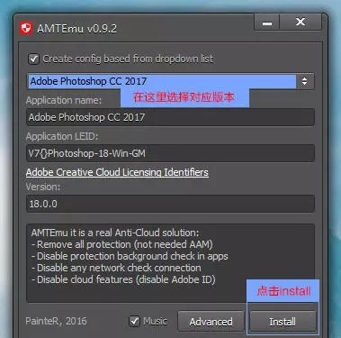 3、選擇對(duì)應(yīng)的版本,點(diǎn)擊Install運(yùn)行安裝(自動(dòng)替換 amtlib.dll,并生成painter.ini配置文件)(Ps:如果軟件未默認(rèn)安裝到C盤(pán),可在彈出的窗口中手動(dòng)找到軟件安裝目錄里面的 amtlib.dll 文件)