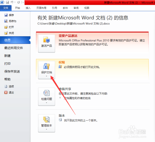 點(diǎn)擊文件按鈕后直接就可以看到箭頭指的選項(xiàng),即保護(hù)文檔。